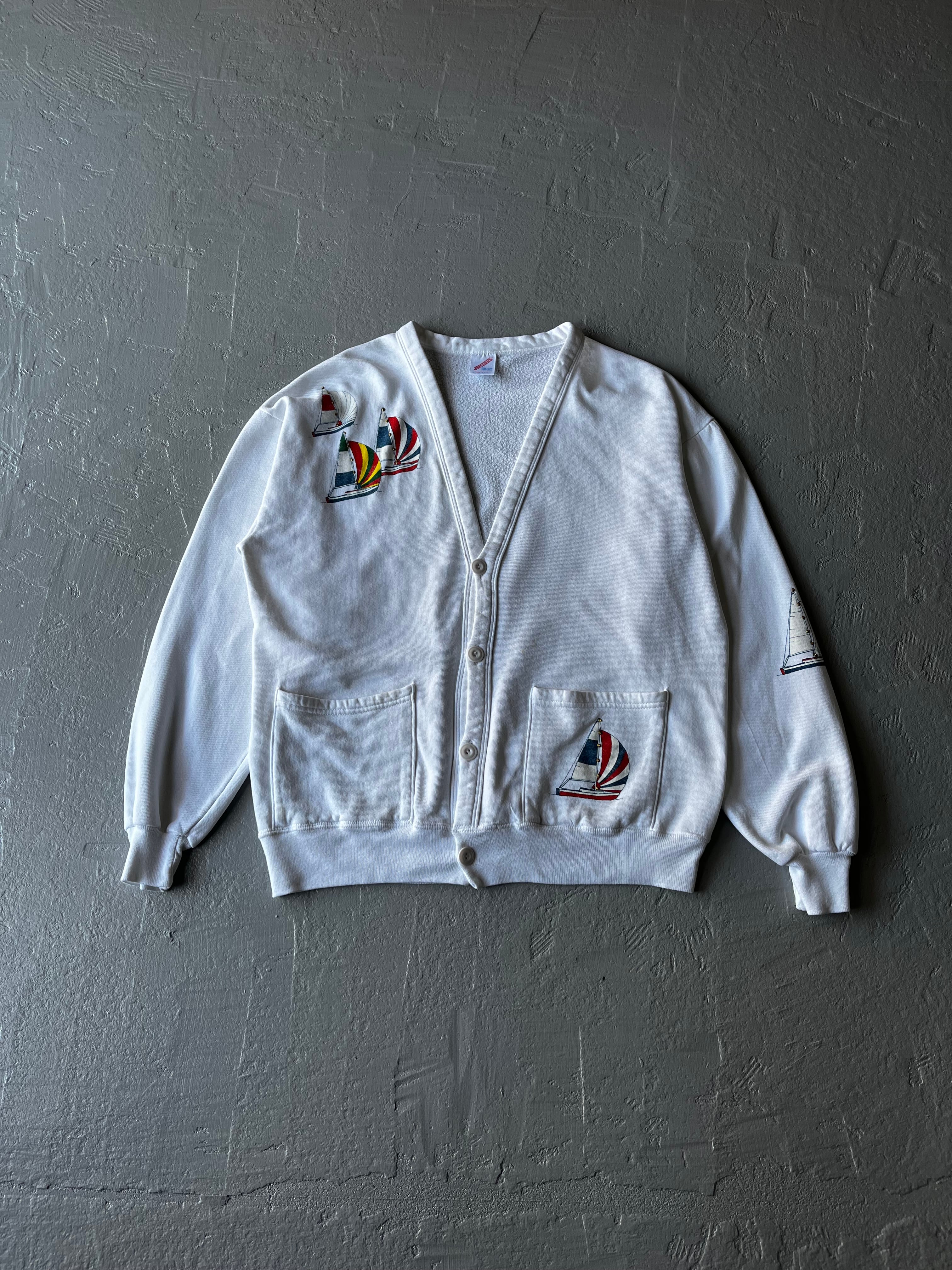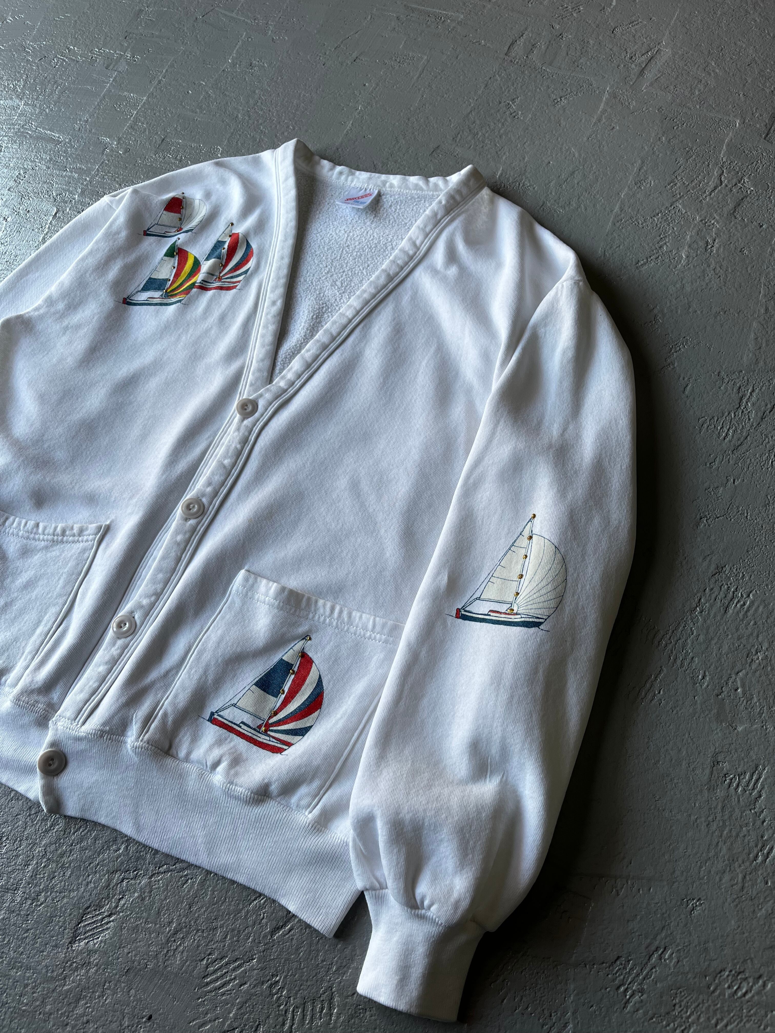 ホワイト:80s 90s JERZEES ジャージーズ スウェット カーディガン アメリカ製 ヨット柄