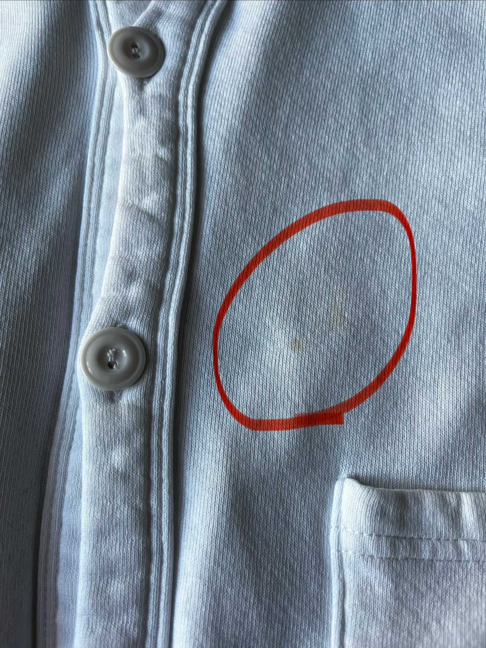 フロントボタン横に薄いシミ汚れ、袖にペンキ汚れなどバック肩部分に小さな傷あります。